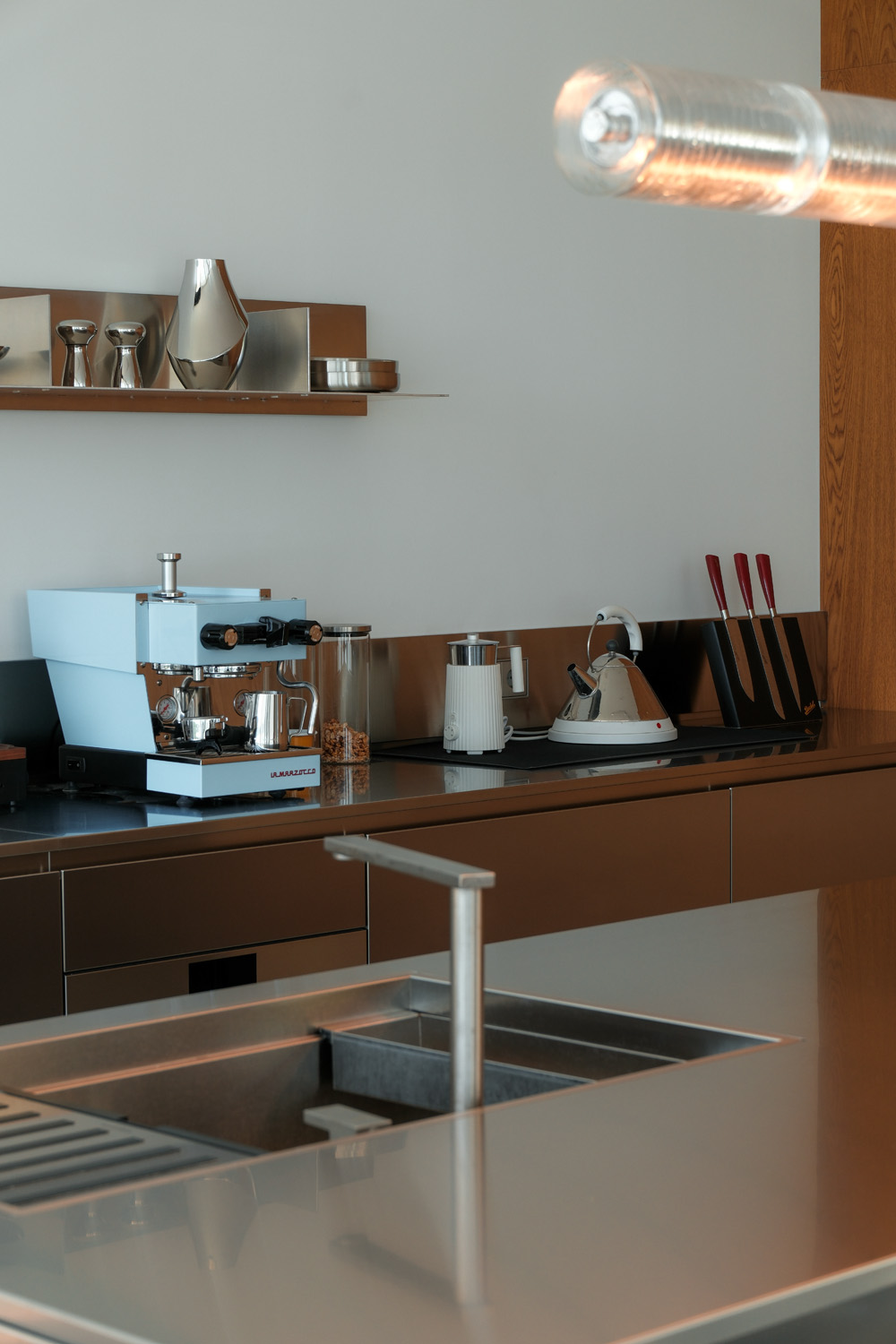 In the kitchen, brushed stainless steel cabinetry and an island anchor the space with an industrial yet polished presence. Iconic bar stools and leather lounge chairs introduce organic warmth against the minimal palette, while sheer curtains diffuse natural light, creating a serene atmosphere.