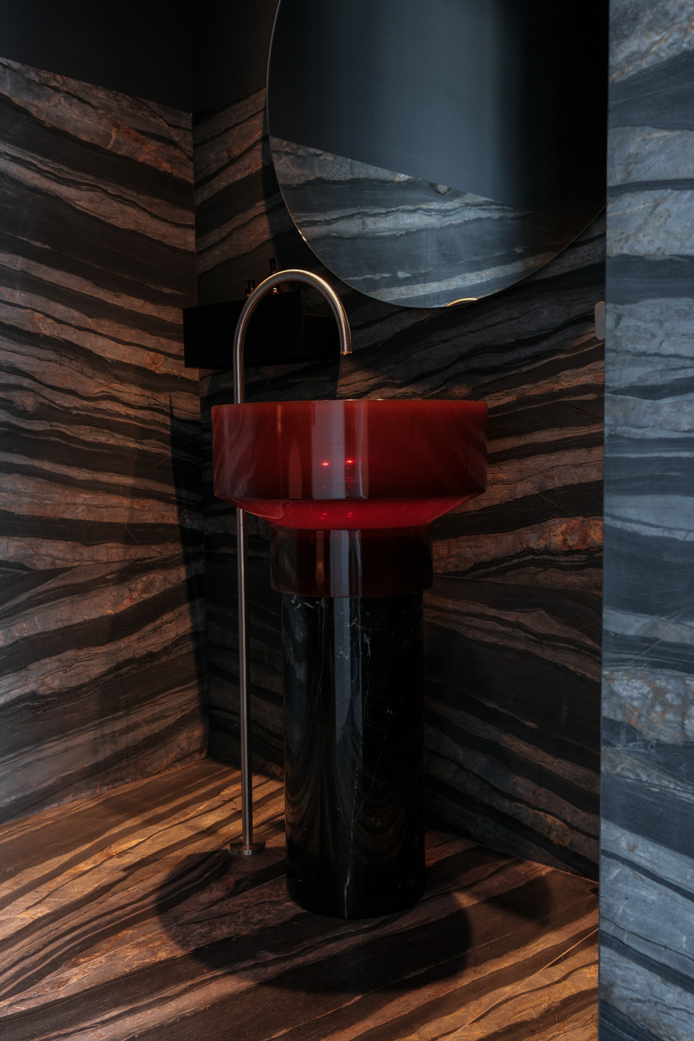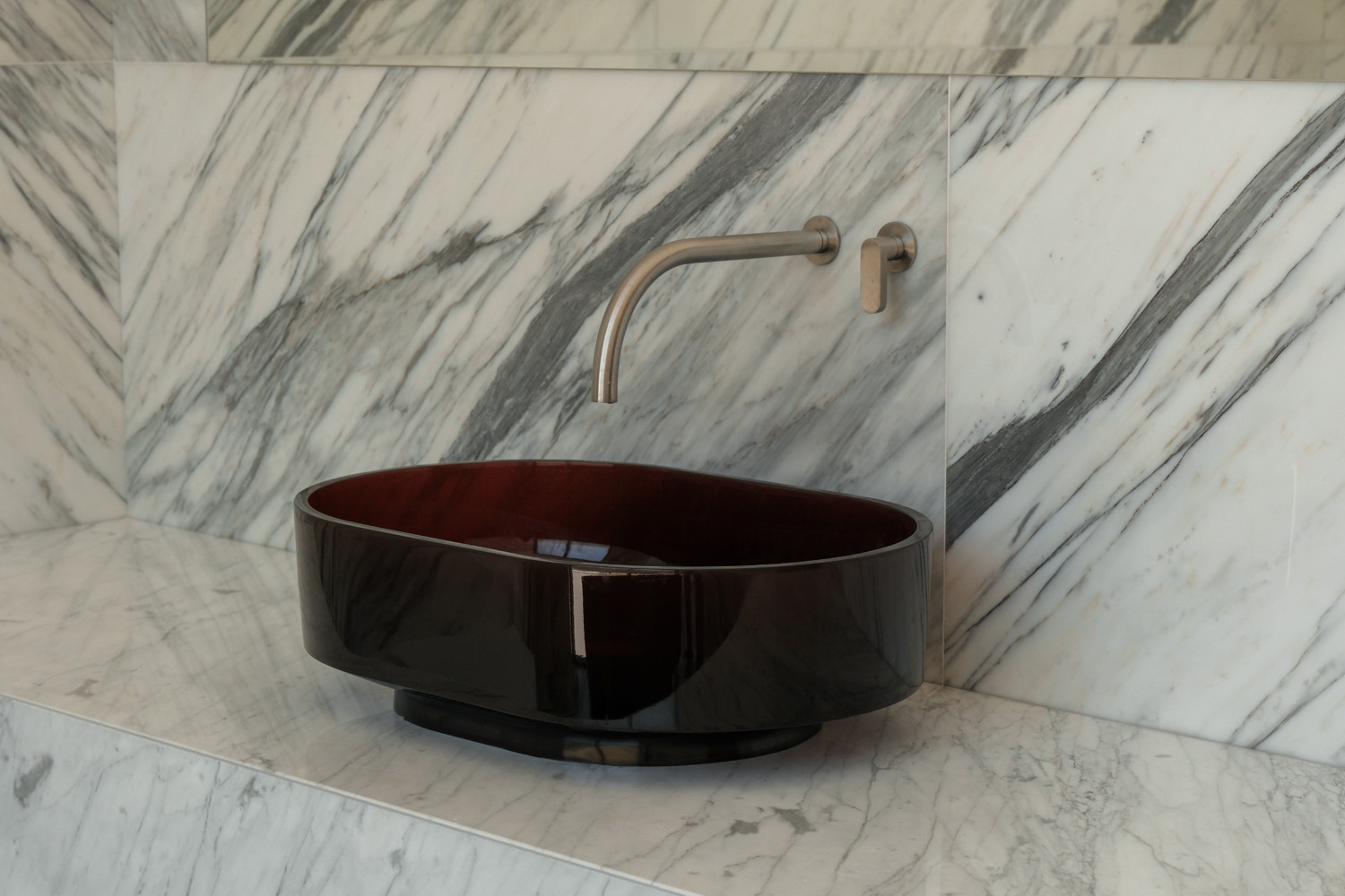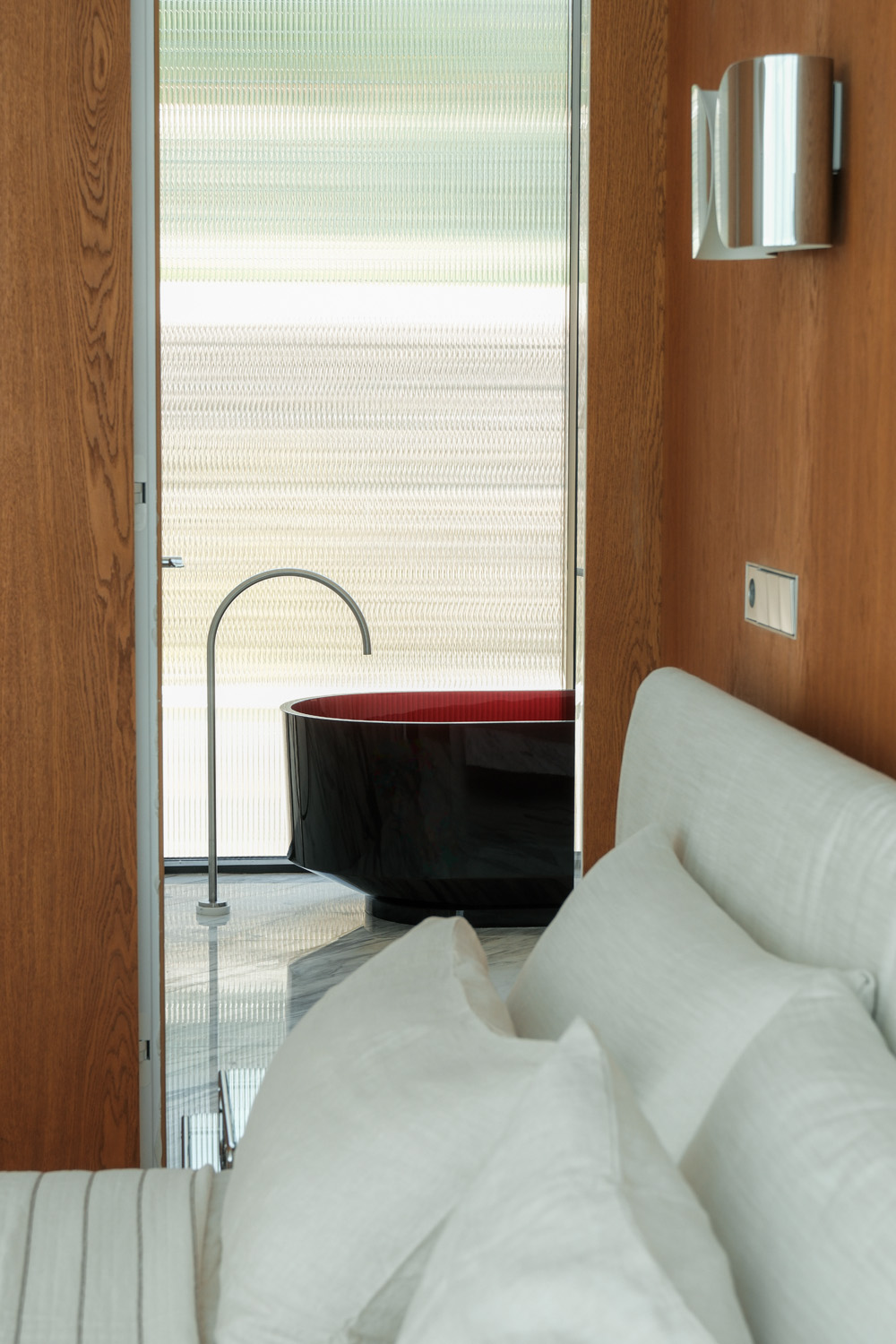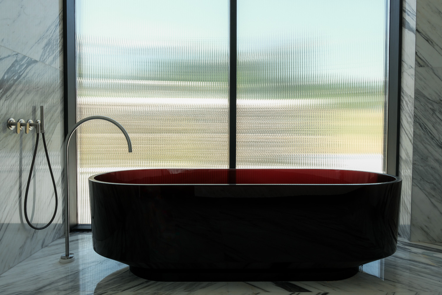 The bathroom is a sanctuary of bold contrasts, featuring veined white marble surfaces and a freestanding black tub with a striking red interior. Fluted glass panels filter daylight, providing privacy without sacrificing the interplay of light and shadow.